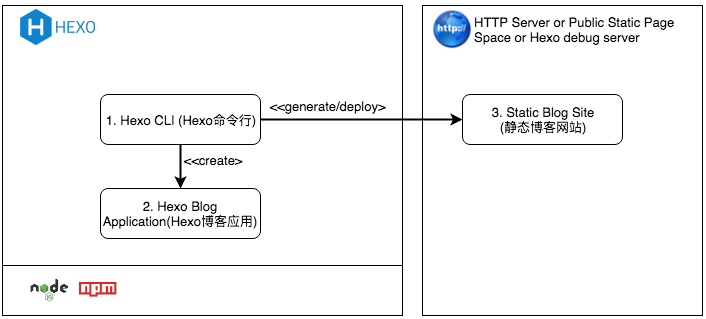 Hexo是一款免费的用来快速搭建静态博客网站的框架。支持插件机制,简单又不失强大。Hexo是基于Node.js开发的,提供了一组命令用来创建和管理博客应用,创建和管理博客文章,将博客应用和文章发布成静态博客网站。Hexo使用Markdown语言来写博客,方便、快捷,不需要什么额外的排版工具就能使你的文章布局看起来很美观。下图是Hexo博客网站的结构: