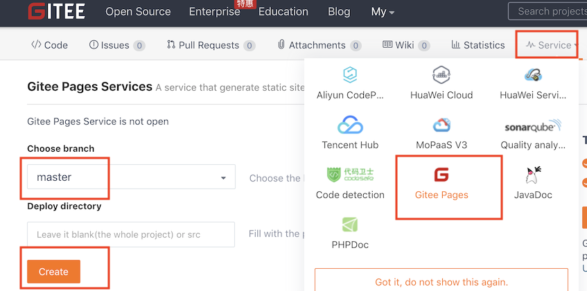 hexo deploy如下图,在码云上点击刚创建的代码仓库页面,点击菜单“Service|Gitee Pages”,在左侧选择“master”分支,点击“create”按钮