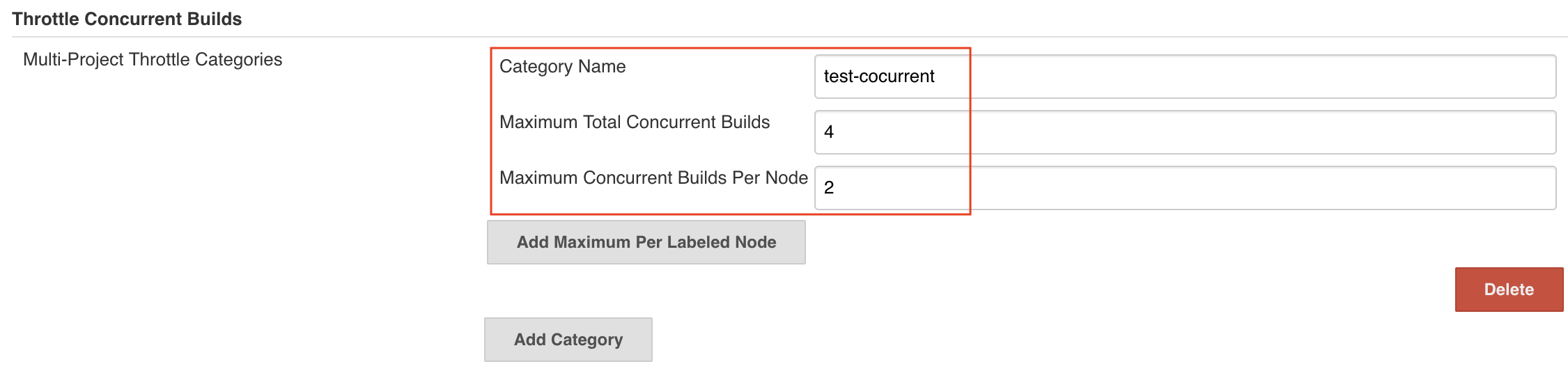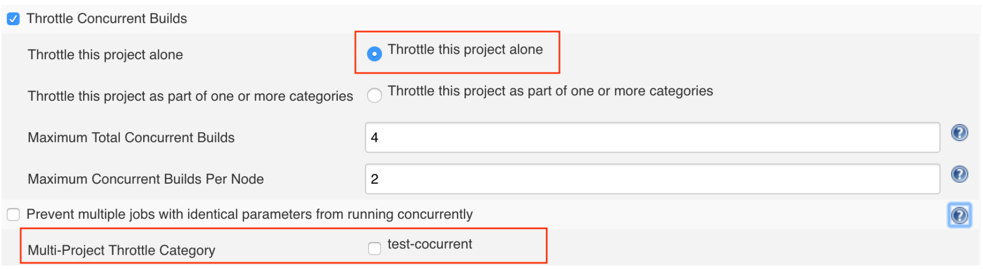 在Job级别,可以选择“Throttle this project alone”,并且设置“Maximum Total Courrent Builds”和“Maximum Concurrent Builds Per Node”这两个值,也可以通过“Multi-Project Throttle Category”选择系统级别配置好的并发执行的类别。