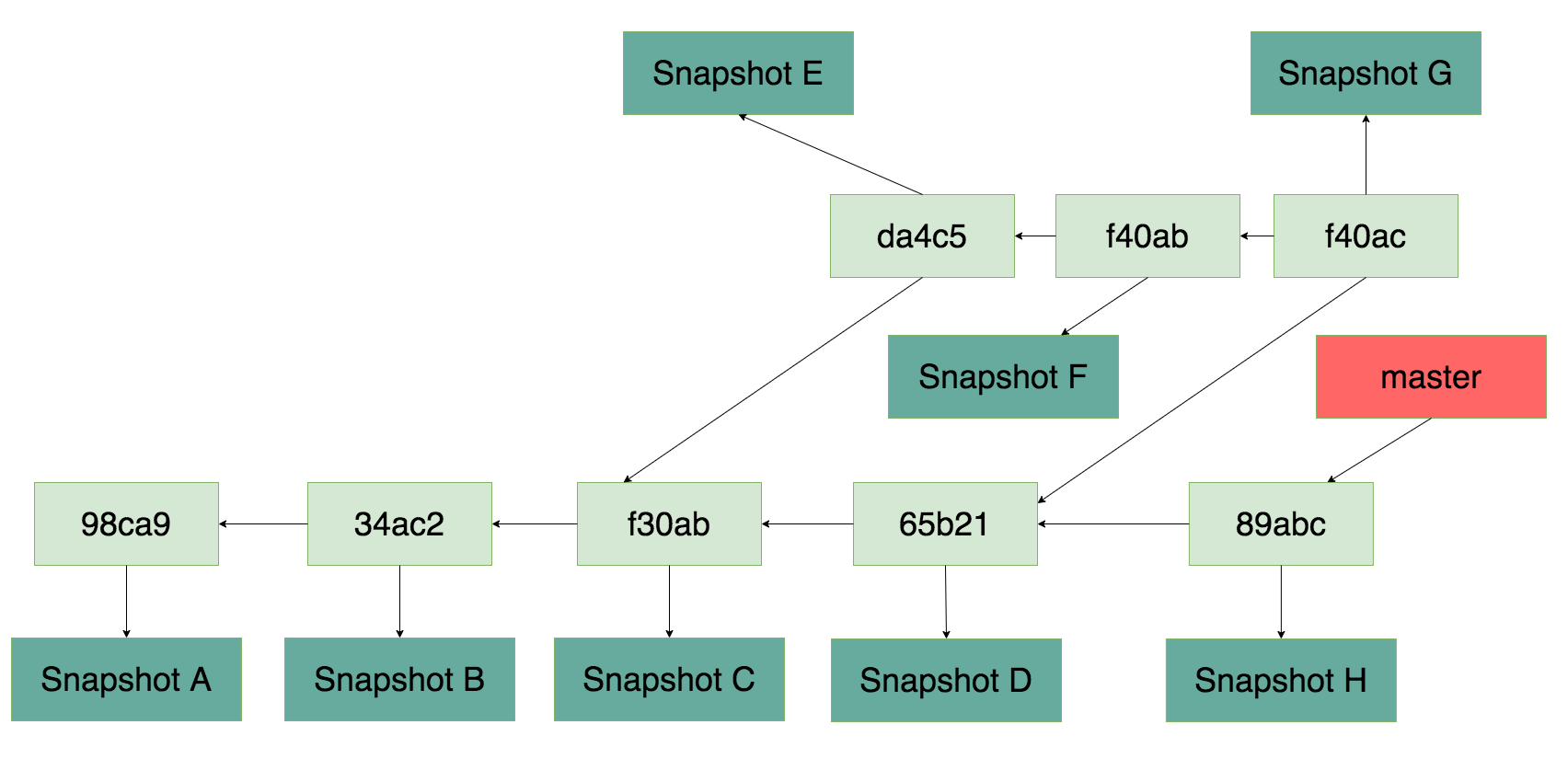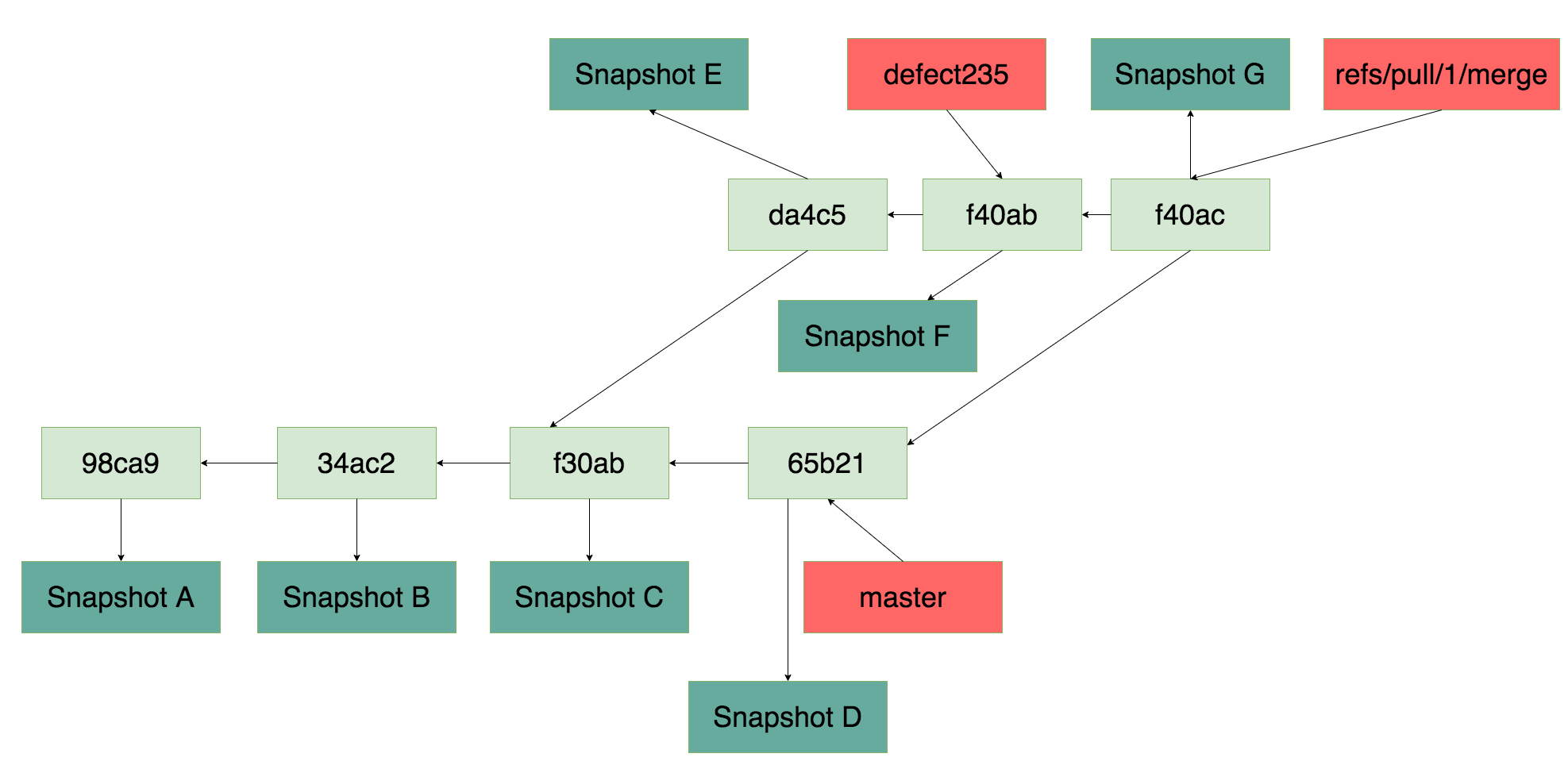 在Git中,数据是以树形结构存储,每个文件对应着一个blob对象,每个文件夹对应着一个tree对象。每一次Git提交(commit),都会根据文件或路径的变化创建一系列新的blog对象或tree对象,checksum不变的对象会被重复引用,其中最顶层的tree对象由于每次都需要变化,所以每次都会创建新的顶层tree对象,同时会创建一个commit对象指向新的顶层tree对象,整个过程犹如给数据做了个快照,而当前的commit对象则是这个快照的标签。如果要获取这个快照对应的代码,只要git checkout到这个commit对象即可。