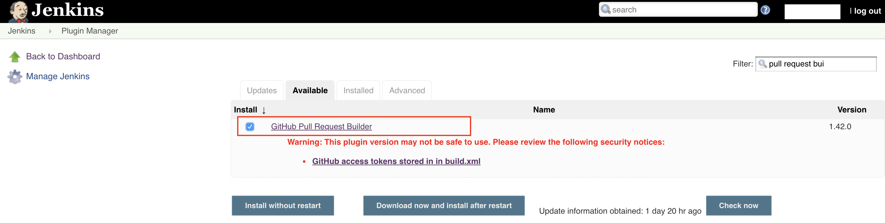 2. 打开Available页面,选择Github Pull Request Builder,点击Install without restart按钮