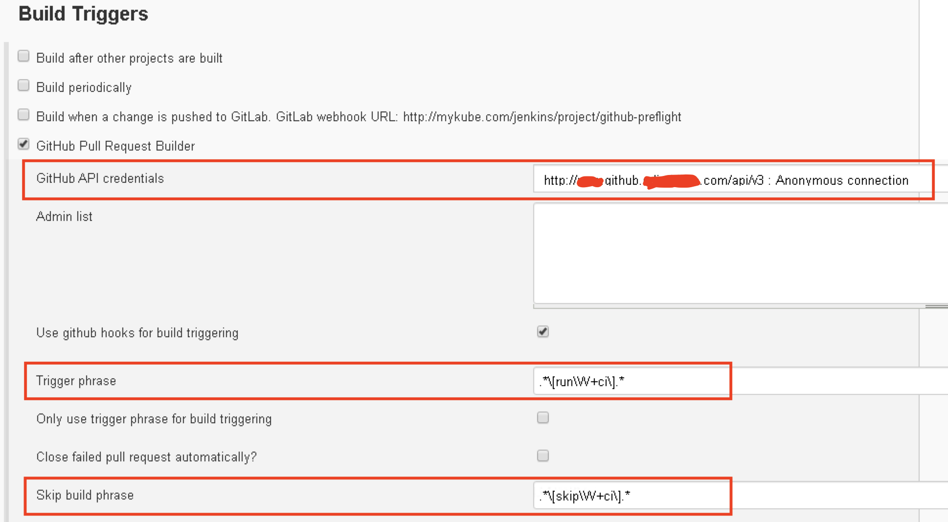• Skip build phrase: 在合并请求(pull/merge request)的注释或标题里加入skip build phrase内容则不会触发构建