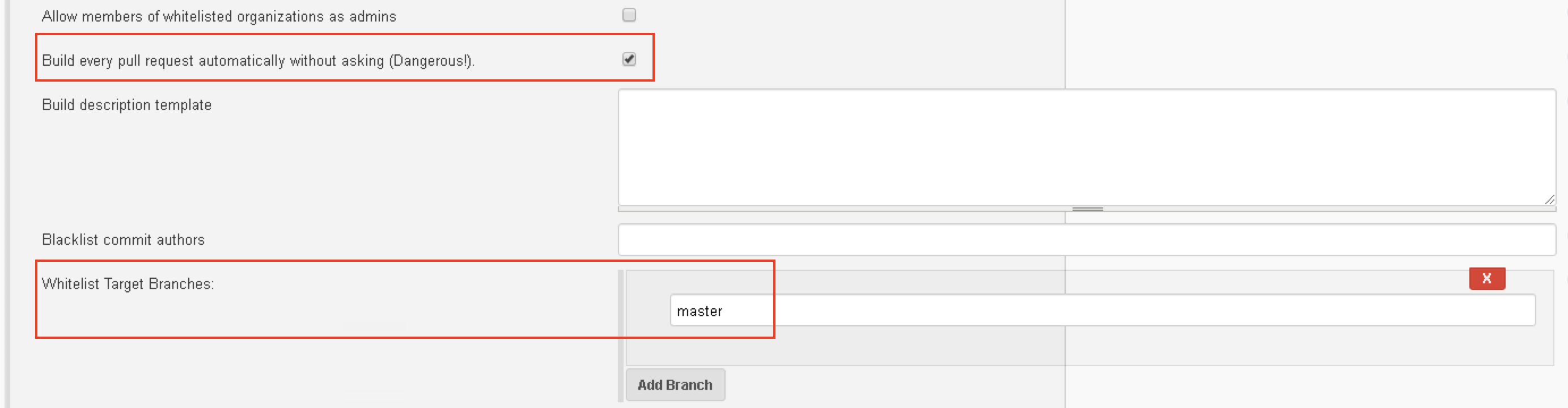 5. 如果需要构建每个合并请求(pull/merge request),勾选”Build every pull request automatically without asking (Dangerous)”,在”Whitelist Target Branches”输入主分支”master”
