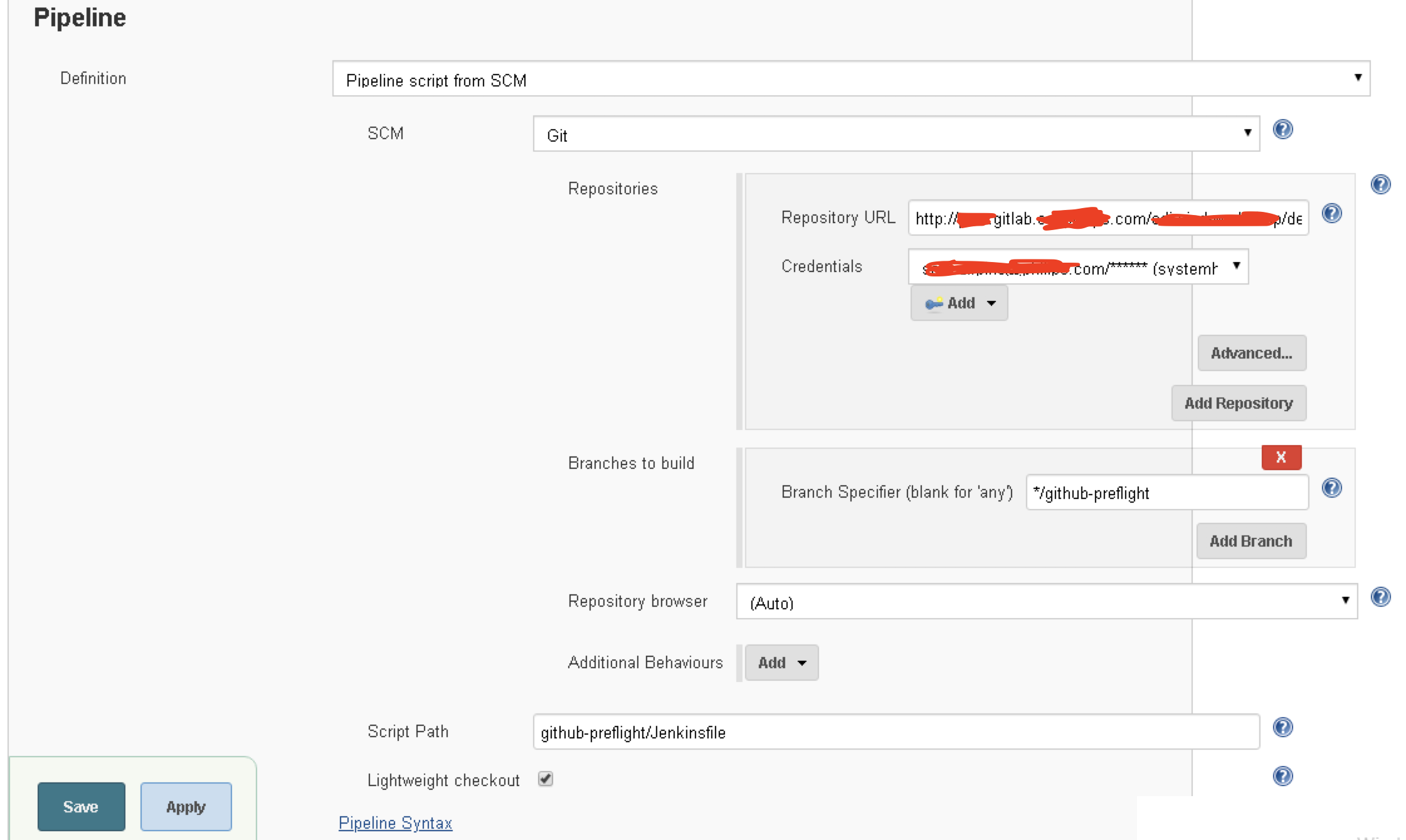 19行: branches选择环境变量”ghprbActualCommit”,它是合并请求(pull/merge request)分支对应的提交号