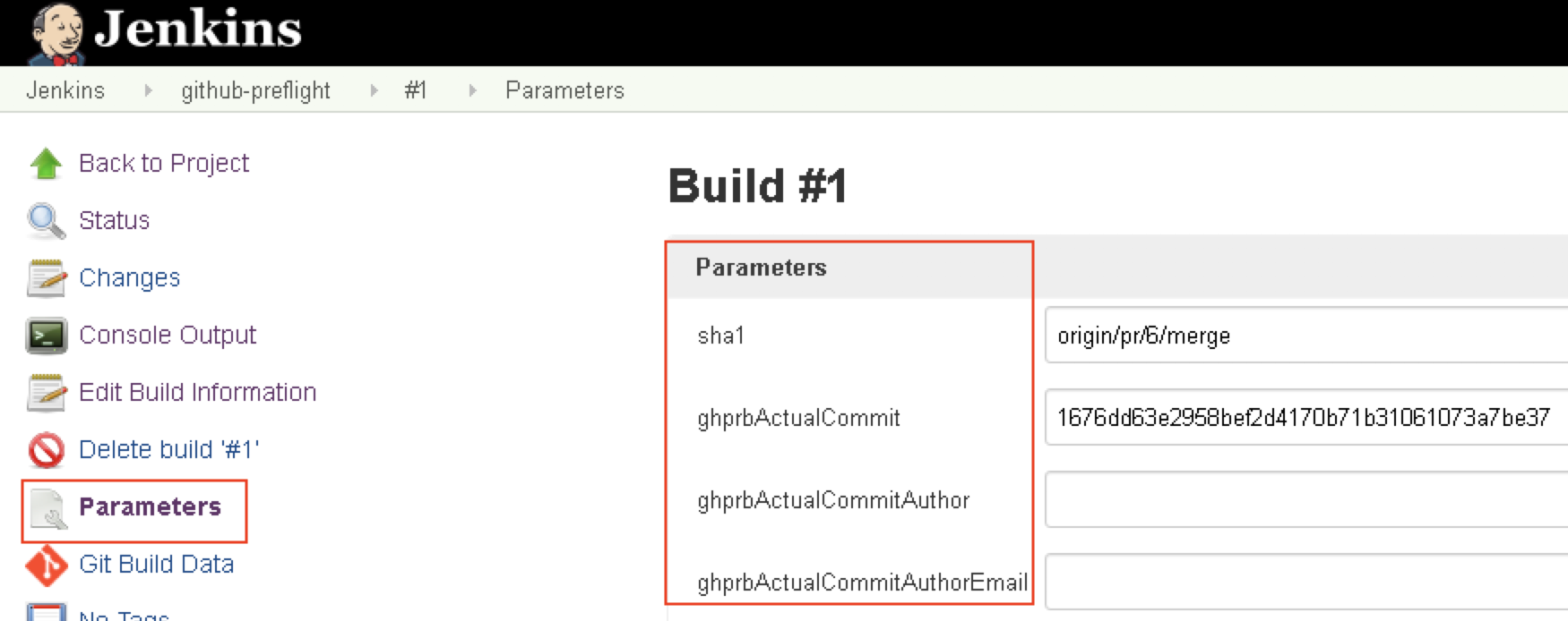 sha1origin/pr/6/merge合并请求(pull/merge request)分支。在构建Job中也可以用${sha1}来代替${ghprbActualCommit}