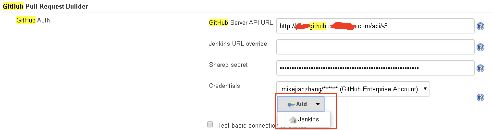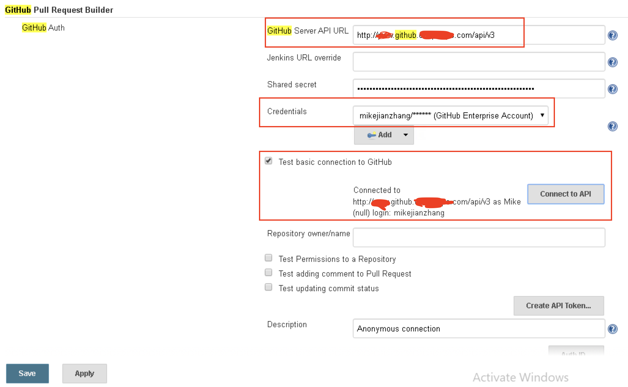 4. 配置GitHub Server API URL,选择步骤3创建的凭证,可以点击”Connect to API”按钮测试基本连接