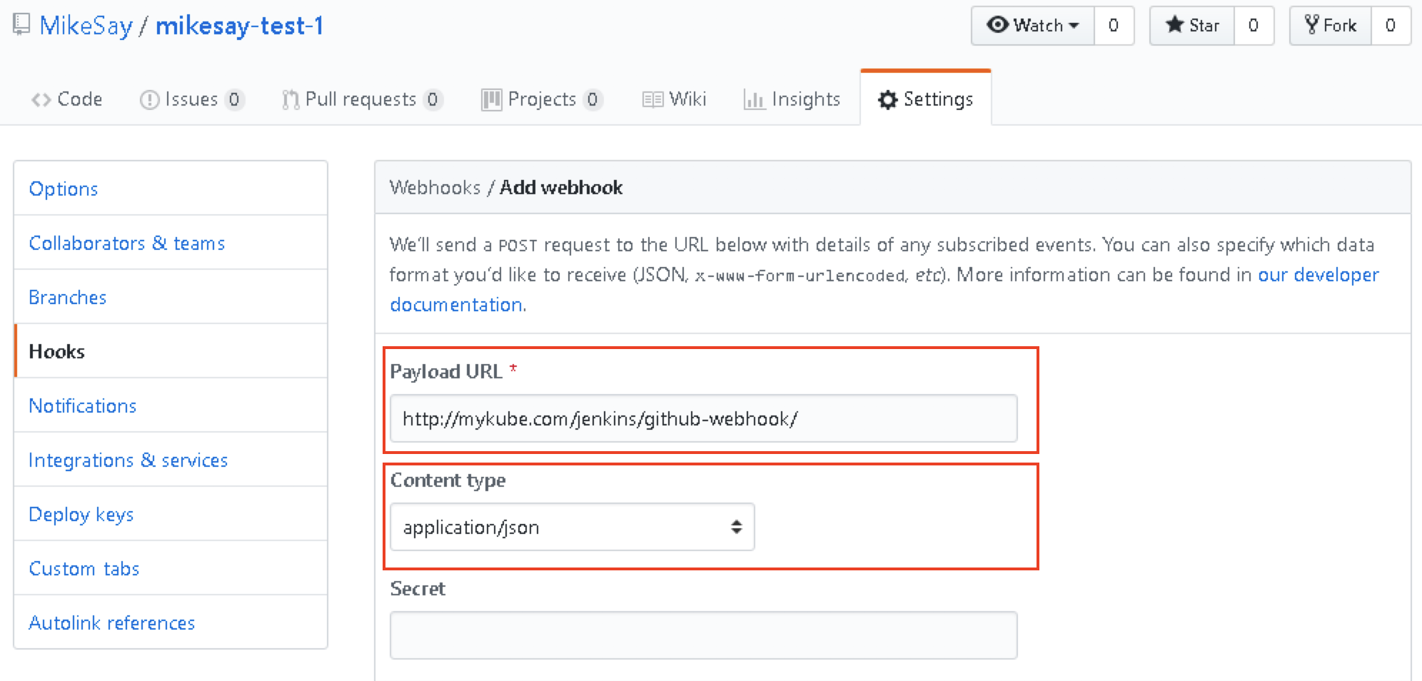 2. 输入Palyload URL(http://jenkins-url/github-webhook/),选择Content Type为application/json