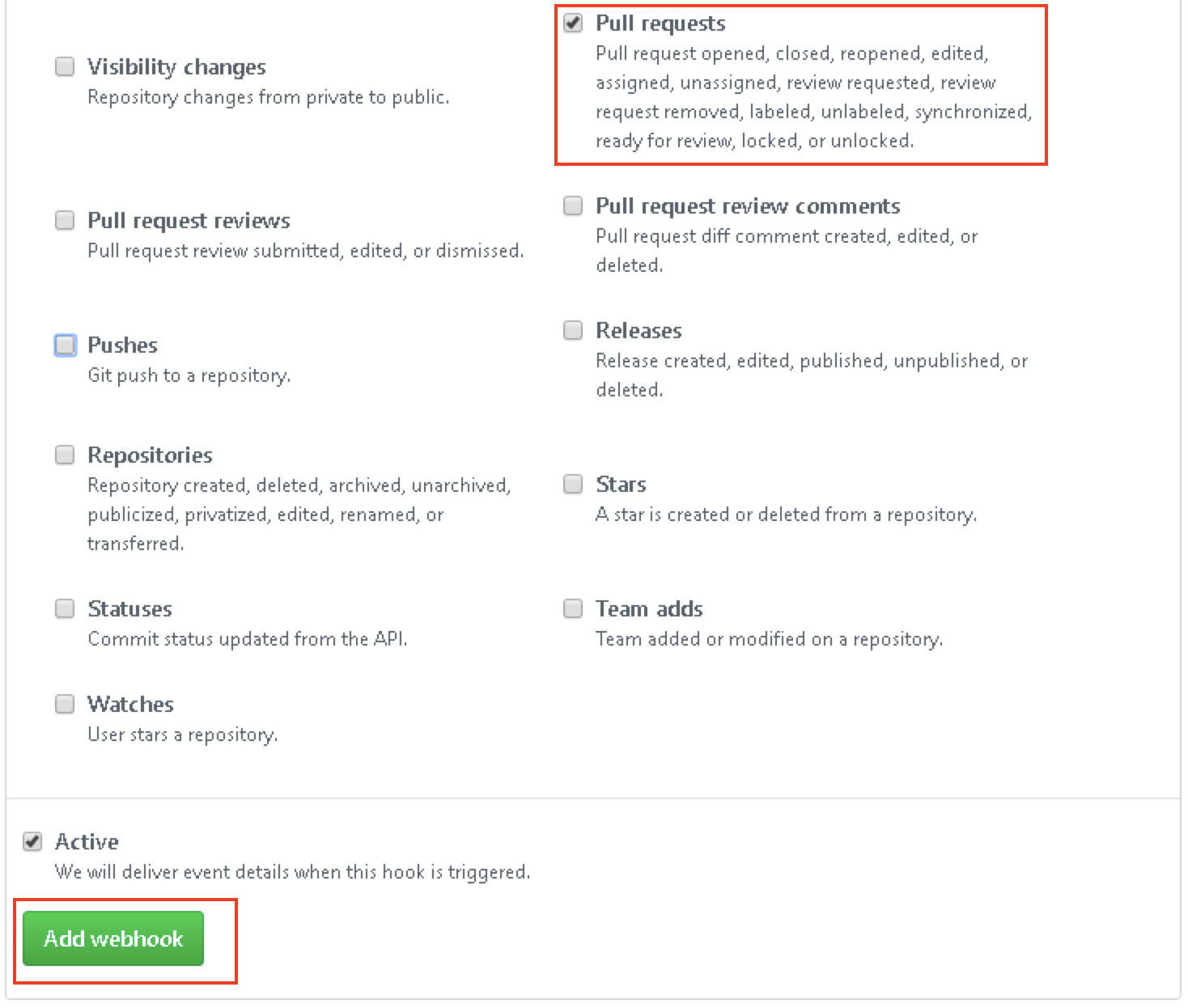 4. 只选择”Pull requests”事件,并点击”Add webhook”保存Webhook