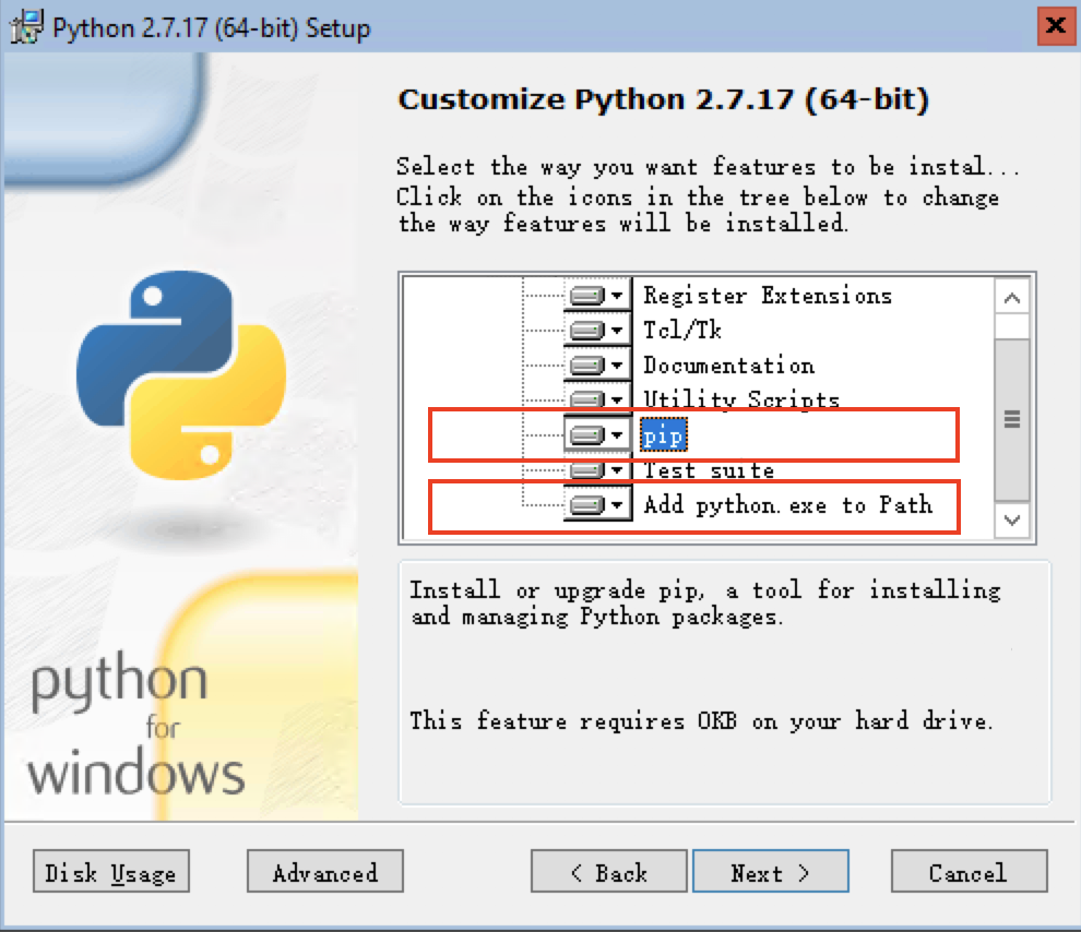 在安装Python2向导中,选择同时安装工具pip以及将python.exe加入Path环境变量中: