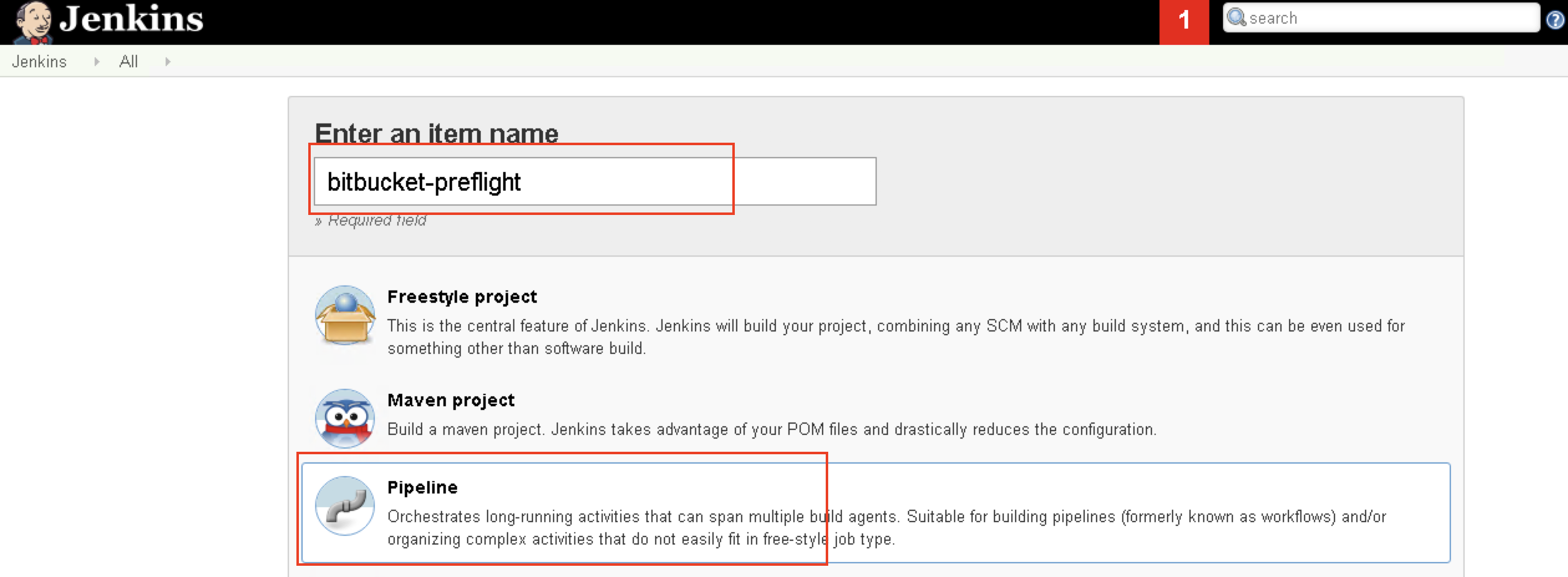 2. 选择Job类型为”Pipeline”,输入Job的名字,比如”bitbucket-preflight”,点击”Ok”按钮