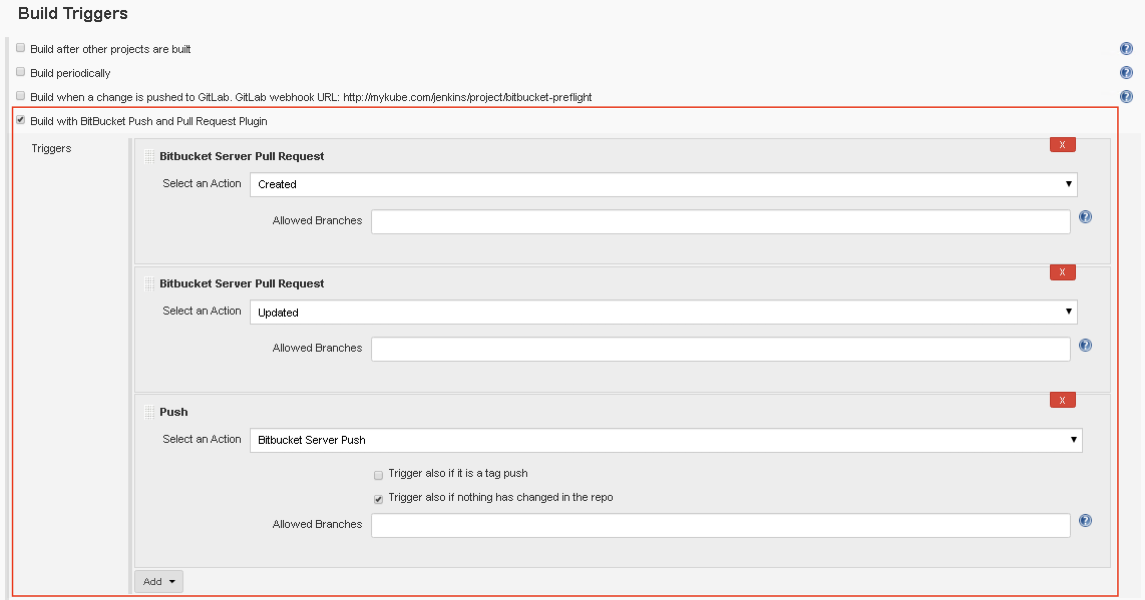 这里选择Push事件是为了解决文章开头提到的Bitbucket插件和Bitbucket Webhook的问题,即提交代码到已有的合并请求(Pull Request)不会触发新的合并请求(Pull Request)的构建。