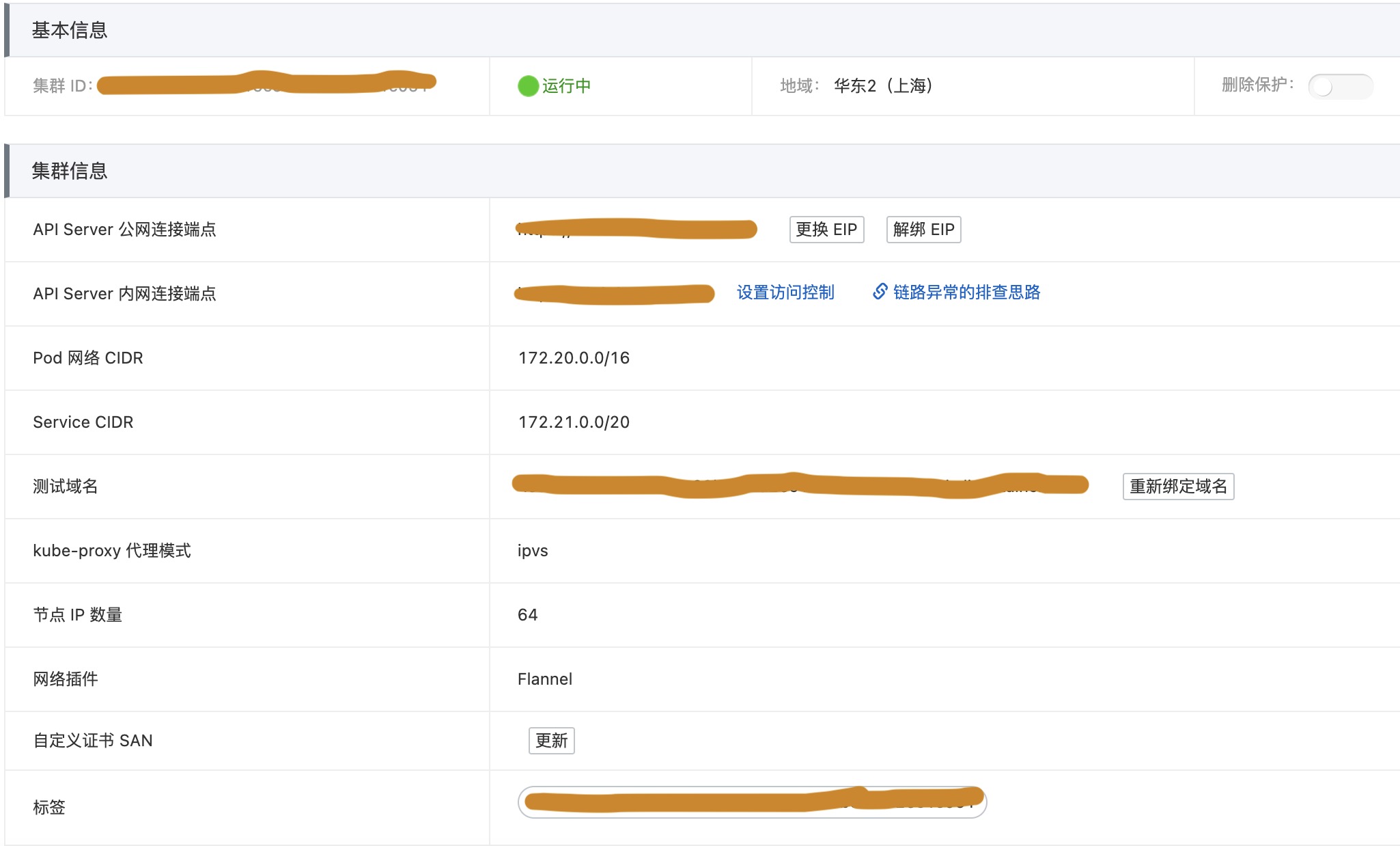 - Pod网络类型是Flannel,CIDR: 172.20.0.0/16。每个工作节点的最大的Pod数量为64 (ECS-1 CIDR: 172.20.0.192/26, ECS-2 CIDR: 172.20.0.128/26 …)