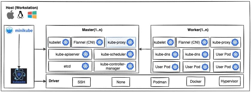 Master和Worker就是Minikube通过驱动层创建出来的Kubernetes集群的工作节点。工作节点可以是运行在主机上的虚拟机、独立的容器,也可以是已经存在的且已经配置好的虚拟机(本地或远程的),或者就是主机本身。