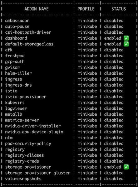 Minikube提供了丰富的开箱即用的插件用来帮助开发人员快速地配置Kubernetes集群,比如ingress插件用来安装ingress controller,dashboard插件用来安装Kubernetes的管理门户。通过命令minikube addons list可以列出支持的所有插件: