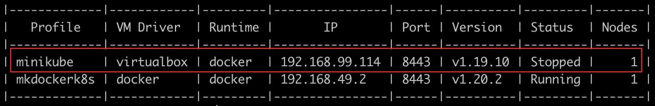 这个命令基于Docker驱动创建了一个单节点的Kubernetes集群。参数-p用来指定集群的名字。